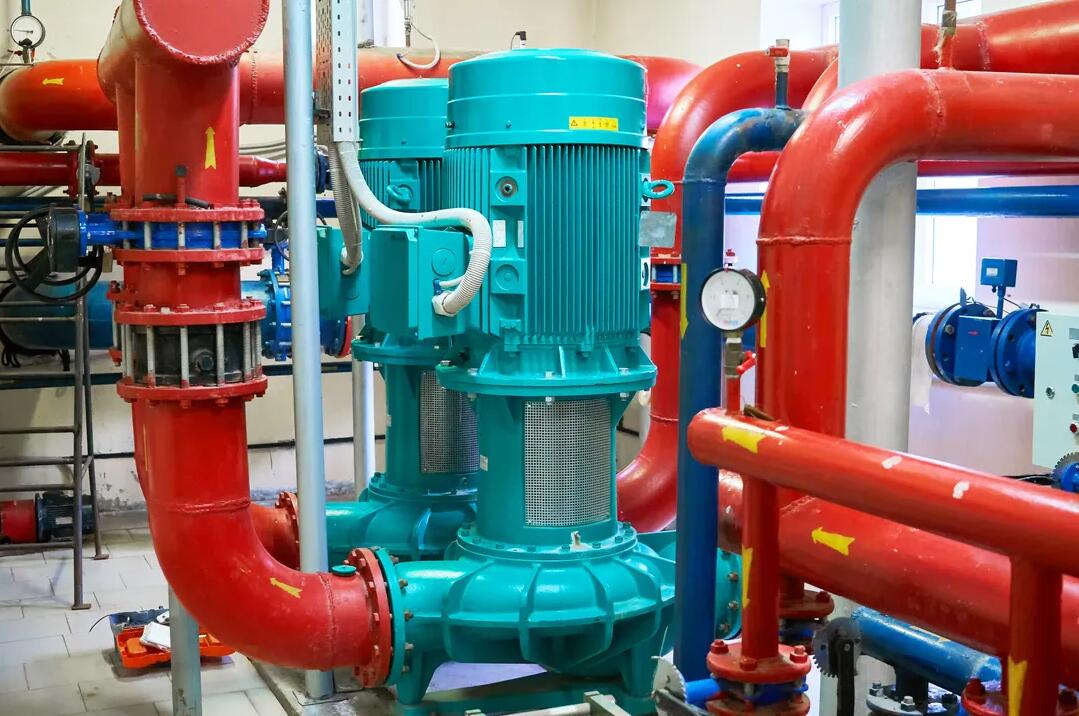 兩個立式發動機涂成藍色,泵連接到涂成紅色的管道。